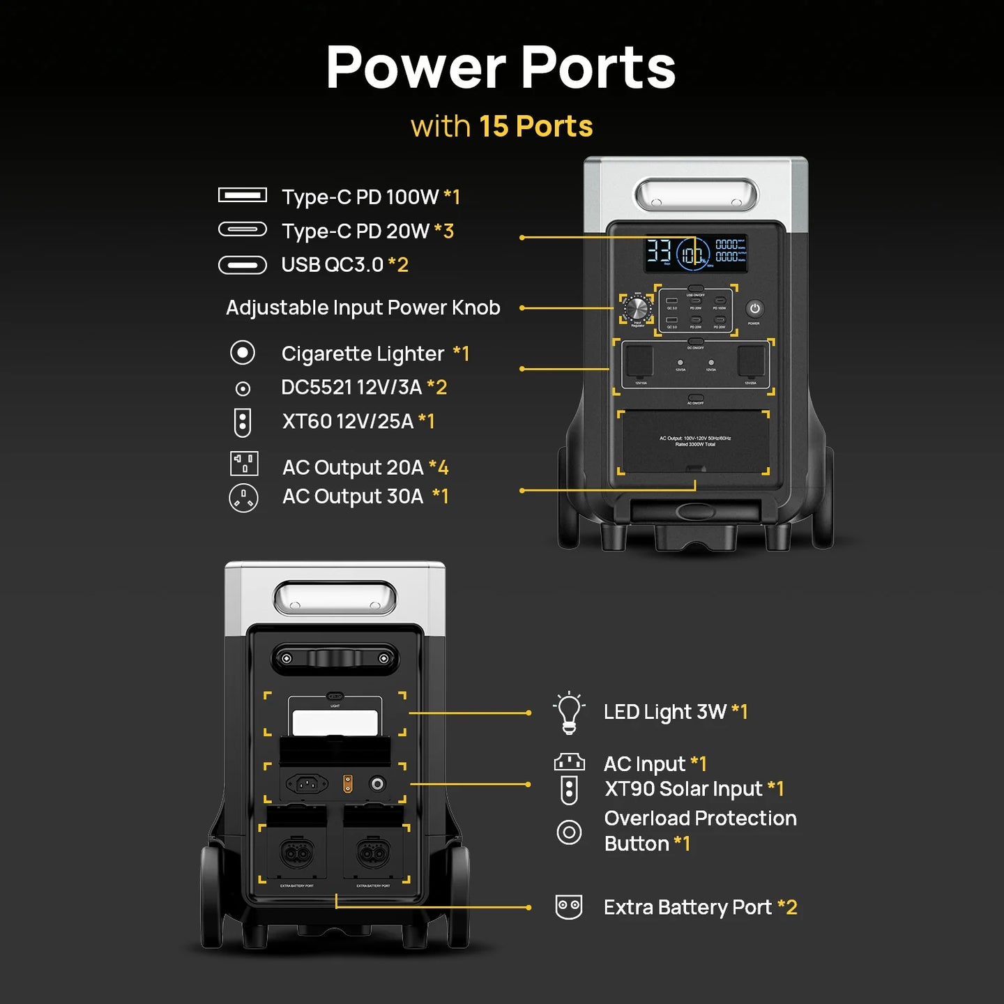 AFERIY P310-EC features a 3600W output power and an expandable capacity, capable of powering up to 15 devices at once. With its versatile range of outputs—including AC outlets, USB-A, USB-C, cigarette lighter port, DC, and XT60 port—it efficiently powers high-wattage devices such as electric tools, RVs, electric vehicles, heaters, air conditioners, and drills. Whether for home, outdoor, or workplace use, the P310-EC meets the energy demands of 99% of high-power equipment without the risk of overloading.