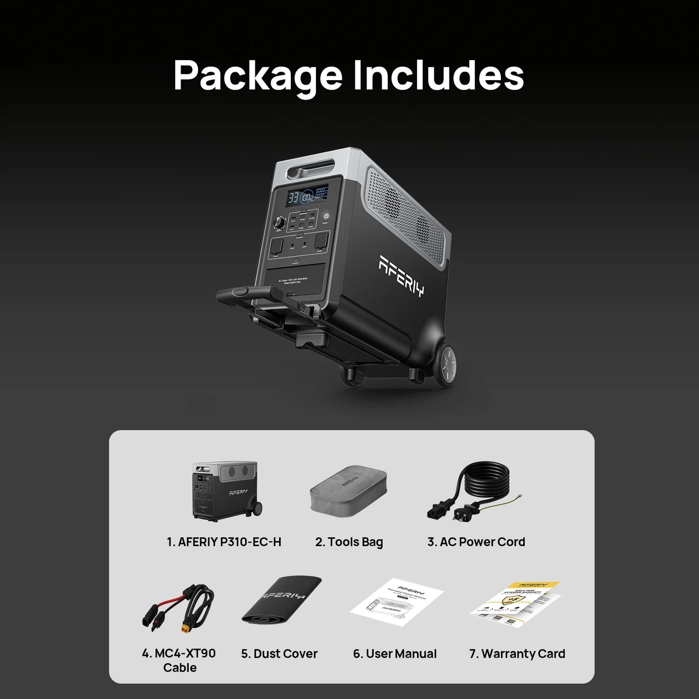 Comes with a 7-year extended manufacturer's warranty and lifetime technical support from the date of purchase. The package contains an AF-P310 portable power supply, AC charging cable, MC4-XT90 cable, instruction manual, dust cover, and storage bag.